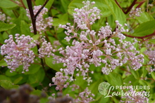 H: 1,5m L: 1m. Feuillage semi-persistant. Variété vigoureuse. Floraison en clochettes parfumées rose pâle à blanc de juillet à octobre.