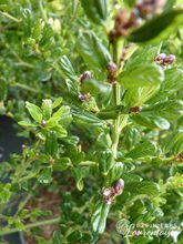 H: 1.5m L: 2m; Arbuste au feuillage vert bleuté. Floraison blanche en été puis baies rouges en automne (appréciées des oiseaux).