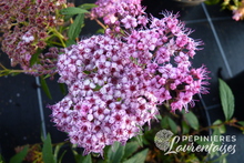 H: 0,8m. Buisson dense. Feuillage cuivré puis vert. Floraison rose foncée de juillet à septembre.