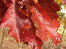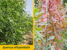 Feuilles aussi longues que larges. Il rappelle un peu le Quercus palustris à coloration automnale assez précoce d'un rouge intense, parfois orangé.